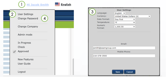 Click on User Settings (2) to update your personal information and change temperature or currency display settings (3)